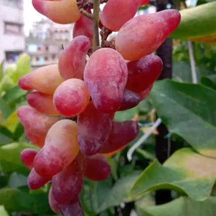 ফলের আকার ও রঙ – লম্বাটে, নলাকার আকারের আঙ্গুর, গাঢ় নীলচে-বেগুনি রঙের।
